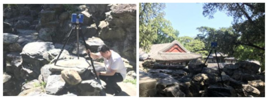 The surveying and mapping conducted for this study not only include the digital surveying and mapping of various garden elements in the Jianxin Courtyard, but also consider the surrounding environment. A total of 102 sites were surveyed using noncontact 3D laser scanning, including the outside environment, garden buildings, vegetation information, water bodies, and rockery space. The point cloud quality was set to 1/8 and 3x, and the point distance was set to 12.272 mm to improve the scanning efficiency. The point cloud quality was then set to 1/4 and 3x, and the point distance was set to 6.136 mm to obtain the details and complete texture information. The scanner has a built-in 70 megapixel digital camera, which could take digital photos of the whole site after scanning at each site to record RGB information within the scanning range.