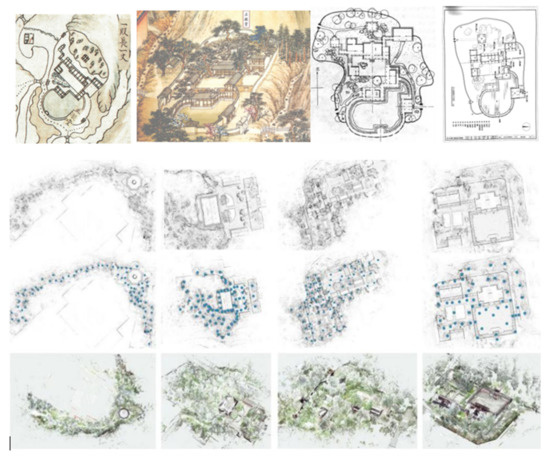 Before conducting the study, drawings of and relevant information about the study site were collected. The collection and analysis of existing drawings and files are helpful in fully understanding the historical changes, garden layout, landscape relationship, and level of surveying and mapping conducted for such gardens within the last century. Additionally, a number of previous maps of the site were scanned and collected, as shown in Figure 3 (a. Jianxin Courtyard in the “Map of Jingyi Garden” by QING Gui and SHEN Huan et al., in the 1780s; b. Jianxin Courtyard in the “Yangshilei” Xiangshan Site Map from 1800; c. plan of Jianxin Courtyard in the “History of Chinese Classical Gardens” by ZHOU Wei quan in 1999; d. general plan of the Jianxin Courtyard renovation from Beijing Construction Engineering Architecture Design Institute in 2006; e. 3D point cloud scans from different locations). Furthermore, in combination with the site survey, the actual situations in the gardens were observed and compared with existing information.