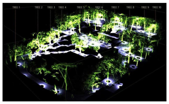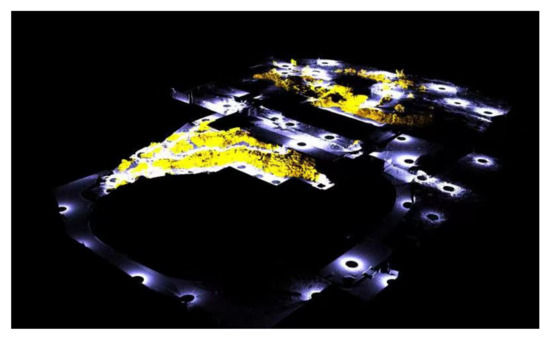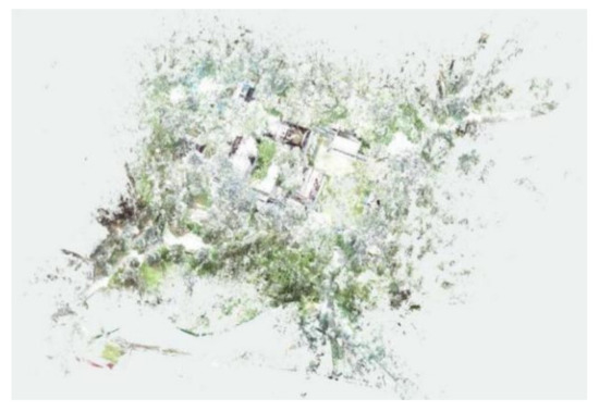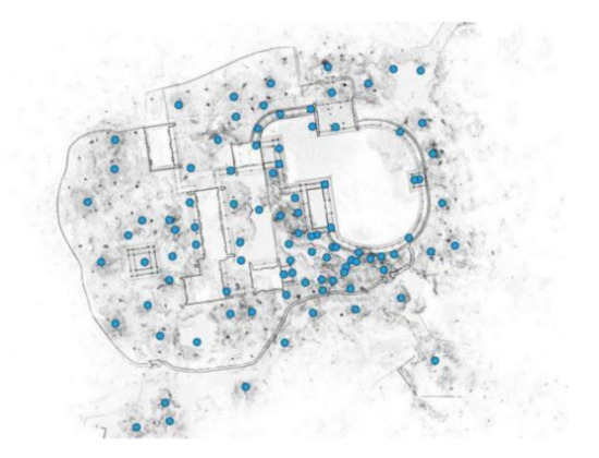 According to the Venice Charter (1964), Florence Charter (1982), Nara Declaration on Authenticity (1994), Xi’an Declaration (2005) and other documents, conservation efforts for historical sites are gradually being expanded, and these methods of conservation are no longer restricted to only the historical sites themselves, but rather, focus on the overall relationship between the heritage sites and their surrounding environments. In areas with complex topographies and abundant garden elements, many measurements from multiple angles at different points are necessary due to mutual occlusions of the measured objects. Then, images must be superimposed to obtain a complete result. After obtaining multisite data, complete spatial information is obtained by combining computer and manual identification of the feature points. Figure 4 shows a scan of the distribution of points in the Jianxin Courtyard. Figure 5 presents a Space Partition Point Cloud Map of the Jianxin Courtyard.