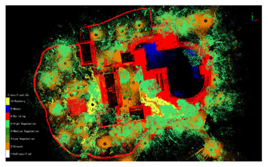 Considering that the results of surveying and mapping should accurately reflect the characteristics of a building, the spatial information obtained for ancient Chinese royal gardens is classified on the basis of the basic garden elements. The main contents include the following categories: water body, plant, environment, rockery, architecture, transportation, and others, as shown in Table 2 below. The classification results of the garden-wide point cloud elements are shown in Figure 8. The resultant two-dimensional plan diagram is shown in Figure 9.