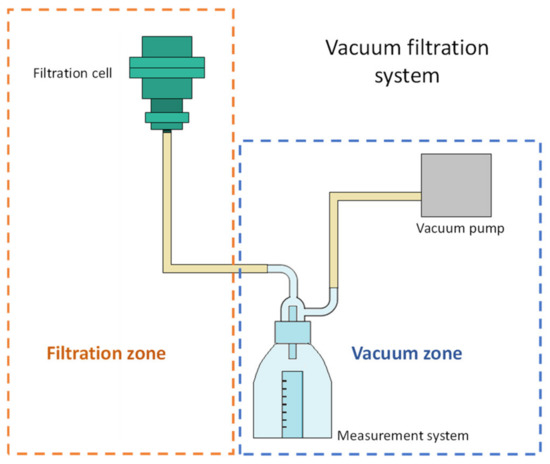 A filtration system was designed and built to perform the filtration tests. An adjustable vacuum pump Siemens model Q2-J14 (Siemens S. A. de C. V, Mexico City, Mexico) was used for the system, with which the suction pressure was varied from 13,332 to 39,996 Pa. The system allows measuring the volume of filtrate in a 10 mL cylinder. Figure 1 shows a filtration system diagram where the tests were carried out, it consists of a filtration zone and a vacuum zone. The vacuum is adjusted by varying the power of the pump.