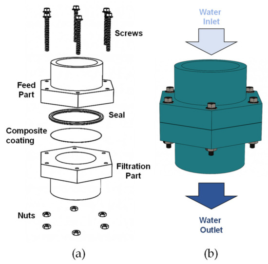 The filter cell used in these experiments was manufactured by 3D printing, using polylactic acid (PLA) as printing material. Figure 2a shows the components of the filtration cell designed and built to execute the evaluations of the synthesized composite coatings. The cell is made up of a feeding section for the liquid to be filtered, which contains a circular hole for the set of the neoprene O-ring as a seal and to delimit the filtering area. Subsequently, the composite coated mesh to be evaluated is set on the neoprene gasket, which is fixed between the upper (feed) and lower (filtration) parts using screws tightened with a torque wrench. Figure 2b shows a diagram of the feeding zone where the liquid is fed through the upper part of the cell and the filtrate is collected in the lower part.