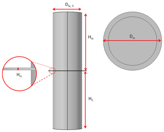 Figure 3 shows the domains used to perform the computational filtering simulation when applying vacuum. The dimensions of the domain are indicated as the diameter of the filtering section (Dfi) and the feeding section (Dfe). Figure 3 also shows the diameter of the composite coating (Dm), its thickness (Hm) the height of the filtration (Hfe) and feeding (Hfi) zones.