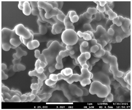 The synthesized carbon material had a spongy appearance, which consisted of agglomerates of CNS. Figure 4 shows, a micrograph of the Scanning Electron Microscope (SEM) obtained at 25,000× with an energy of 3 kV using secondary electrons. With these conditions, it was possible to obtain high-resolution details of the morphology of the nanospheres. A round structure of the carbon nanospheres can be seen, with an average individual diameter of 216 nm. A growth with a linear tendency of agglomerate is observed in the nanospheres, with a uniform growth, greater details of the structure cannot be achieved by the equipment and the conditions used.