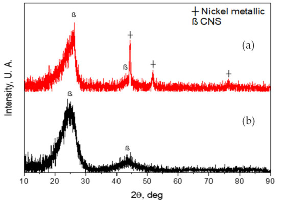 Figure 5a shows the diffractogram of the nanospheres from the CVD reactor with Ni catalyst traces. This figure shows the diffraction of the characteristic crystalline planes of carbon materials, in this case of the nanospheres (CNS), at 2θ of 26.126° and 43.58°; for nickel at 2θ 44.46°, 51.75° and 76.36°, which come from the catalyst to obtain the nanospheres [49,50,51,52]. On the other hand, Figure 5b shows the diffractogram of the nanospheres, but without Ni catalyst traces. In this figure, only the crystalline planes of the characteristic graphite of the nanospheres can be seen at 2θ of 26.126° and 43.58° [53,54]. The traces of Ni catalyst were present because these CNS were taken from the tray where the catalyst was poured before the CVD synthesis. CNS of both diffractograms were subjected with a thermal treatment at 500 °C for 1 h.