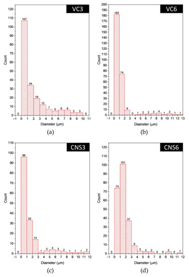 The smallest standard deviation values for epoxy-VC coatings were 0.03 (diameter range 8 µm) and 0.02 (diameter range 6 µm) for VC3 and VC6, respectively. The largest standard deviation values for epoxy-VC coatings were 0.39 (diameter range 4 µm) and 0.34 (diameter range 2 µm) for VC3 and VC6, respectively. The smallest standard deviation values for the epoxy-CNS coatings were 0.06 (diameter range 2 µm) and 0.07 (diameter range 12 µm) for CNS3 and CNS6, respectively. The largest standard deviation values were 0.4 (diameter range 7 µm) and 0.39 (diameter range 4 µm) for CNS3 and CNS6, respectively. As we can see in Table 2, the difference between the standard deviation values was greater for the epoxy-CNS coatings. This may be related to the difference in the physicochemical nature of the epoxy-CNS mixture, compared to the epoxy-VC mixture.