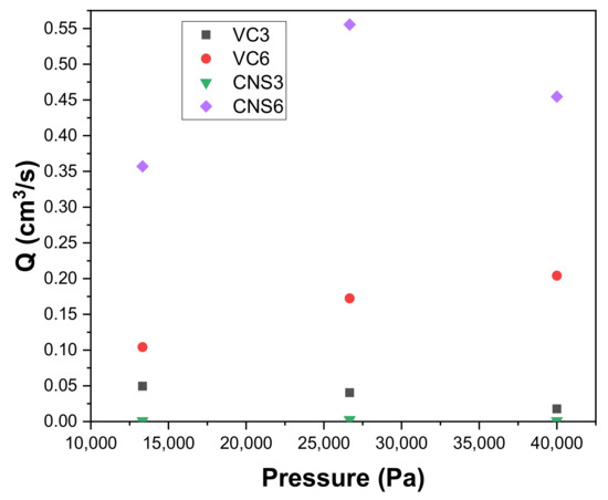 Figure 8 shows the permeation fluxes Q (cm3/s) of epoxy-VC and epoxy-CNS coatings produced with different concentrations of isopropanol during vacuum filtrations applying different working pressures. When comparing the permeation flux of the VC3 and VC6 coatings, the VC6 permeation fluxes are higher and increase with increasing working pressure: 0.1042 cm3/s for 13,332 Pa, 0.1724 cm3/s, 26,664 Pa, and 0.2041 cm3/s, 39,996 Pa. Meanwhile, for VC3 coatings, a decrease of permeation flux was observed with increasing applied pressure: 0.0495 cm3/s for 13,332 Pa; 0.0403 cm3/s for 26,664 Pa, and 0.0177 cm3/s for 39,996 Pa. This difference is observed despite both coatings having similar physical characteristics, with porosity percentages of 35% and 33%, and a thickness of 0.307 and 0.305 mm, for VC3 and VC6, respectively. The higher permeation flux obtained in VC6 coatings is explained by these coatings having larger pore diameters, with ranges of 4–13 µm, and have a higher quantity of small diameter pores, while for VC3 the pore diameters are between 6–11 µm. When analyzing the effect of the increase in the working pressure in the epoxy-VC coatings, in VC3, the increase in pressure generates a compaction in the pores, which results in decreasing the permeation flux [55,56]. However, in the case of VC6 coatings, the pressure increase does not appear to affect significantly.