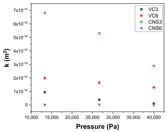 Figure 9 shows the permeabilities k (m2) as a function of the applied working pressures obtained with the epoxy-VC and epoxy-CNS coatings during vacuum filtrations. In all cases, epoxy-VC and epoxy-CNS coatings showed a decrease in permeability as working pressures increased. This was only different in the case of CNS3, where there was a slight increase in permeability when the pressure went from 13,332 Pa (3.61858 × 10−16 m2) to 26,664 Pa (4.44098 × 10−16 m2), and a notable decrease at 39,996 Pa (1.20619 × 10−16 m2).