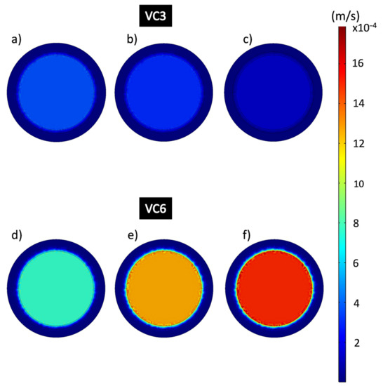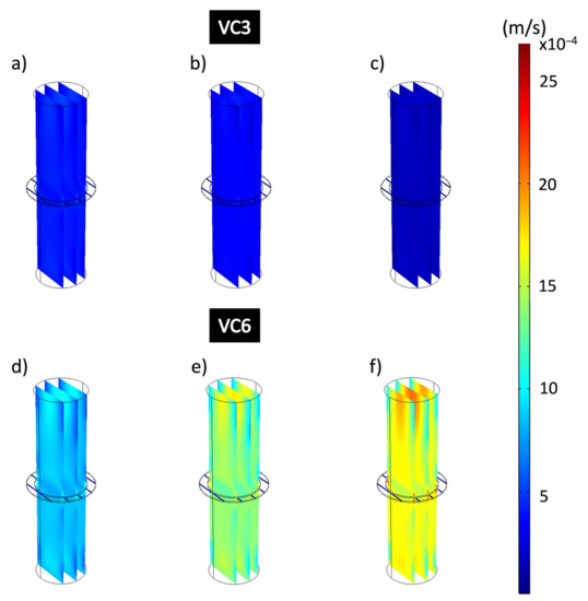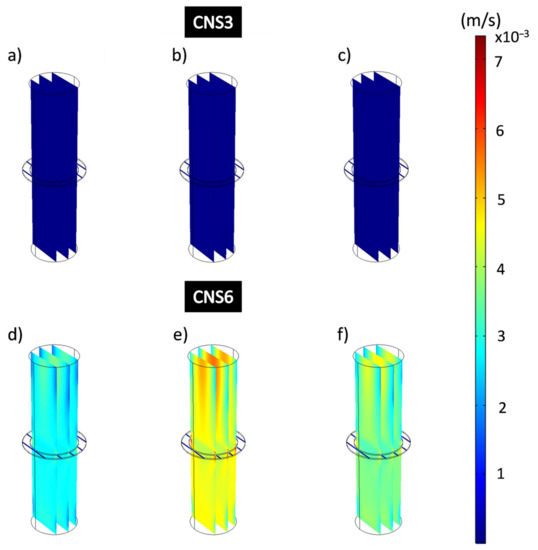 The CFD analysis was carried out to determine the distribution of flow velocities in the internal zone of the filtration cell, as well as through the nanocomposite coatings. For these tests, a simple filtration cell design was used, consisting of a vertical cylinder-shaped filtration zone, secured against leakage. This, so that its design would not intervene in the characterization of the flow through the synthesized nanocomposite coatings. With the information obtained by this analysis, we can understand how the characteristics of the nanocomposite coatings, such as their thickness and percentage of porosity, affect the flow and the working pressure requirement. Additionally, these studies provide details about the aspects of the filtration cell design and the structural properties of the coatings that could be modified to optimize the filtration process and to reduce the required working pressure.