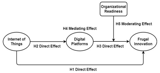 Digital platforms carry benefit for customers and businesses in developing connections, while the development of the IoT depends on digital platforms [36]. Our research disputes that digital platforms play a mediating role between the IoT and frugal innovation. Various organizations and enterprises obtain benefit from digital platforms through accomplishment of the IoT and frugal innovation [33,37]. Digital platforms allow to the collection and sharing of data, knowledge and information to boost efficiency of business functions for attain frugal innovation through the IoT [35,38]. The IoT has recommended a broad variety of digital platforms that perform all functions of businesses [22]. The IoT used digital platforms for facilitating businesses in gathering information and data necessary for frugal innovation [39]. The IoT offers a broad variety of digital platforms to businesses for the acquisition of innovation-related information. Digital platforms act as strong connection between the IoT and frugal innovation [38].
