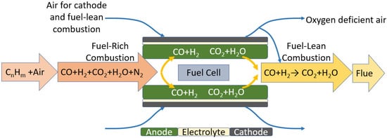 In the next few sections, the operating principles of the fuel-rich combustion, the SOFC, and the fuel-lean combustion are outlined. In this paper, modeling efforts mainly focus on the SOFC, since the fuel-rich and fuel-lean combustion models are well established in the literature and are largely independent of the fuel cell. More details of fuel-rich and fuel-lean combustion models can be found in a previous study [].
