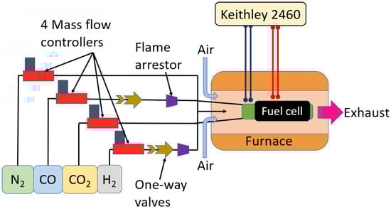 The model dry exhaust gases were mixed and sent to the fuel cell placed inside a furnace at 1073 K. The current density and the voltage were measured using a sourcemeter (Keithley 2460) connected to both the cathode and anode via current collectors using the four-probe technique. In the four-probe technique, a high impedance current source supplies current through two outer probes, while a voltmeter measures the voltage across the two inner probes []. Flame arrestors were placed in line with the CO and H2 lines to avoid flashback. Air for oxidation came from the environment, as shown in Figure 2.