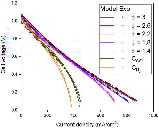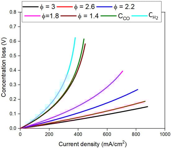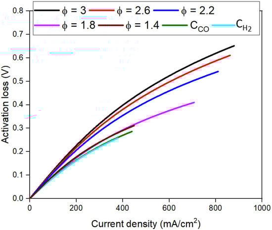 Figure 5 shows the dependence of ɳact on j at different CR,0. Figure 5 shows that for low values of CR,0 (up to Φ = 1.4) ɳact is constant and low at the same j values. This happens because at low CR,0, the available reaction sites in the fuel cell can activate most of the available fuel in the gas composition. As CR,0 increases, the limited number of reaction sites cannot accommodate the arbitrarily increasing fuel CR,0 in the limited residence time in the fuel cell. The fuel cell thus has a larger ɳact. ɳact depends on the number of reaction sites, which vary with porosity, tortuosity, surface roughness, dimensions of the fuel cell, etc. []. Thus, modifying any of these parameters should theoretically affect ɳact. More experimental work in FFCs is required to confirm this hypothesis. Thus, care needs to be taken while designing the FFC to account for the range of CR,0 that the FFC is expected to operate under and to minimize the effect of activation limitations. When the jT is-limited by high ɳact, the fuel cell is considered activation-limited.