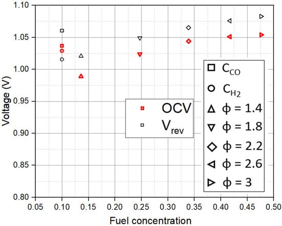 Dependence of the open circuit voltage (OCV) and reversible potential (Vrev) on fuel concentration (CR,0).