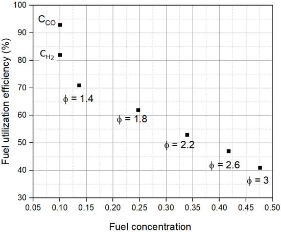 4.4. Dependence of Fuel Utilization Efficiency on Fuel Concentration