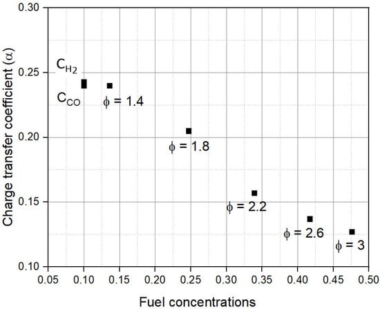 Dependence of charge transfer coefficient (α) on fuel concentration (CR,0).