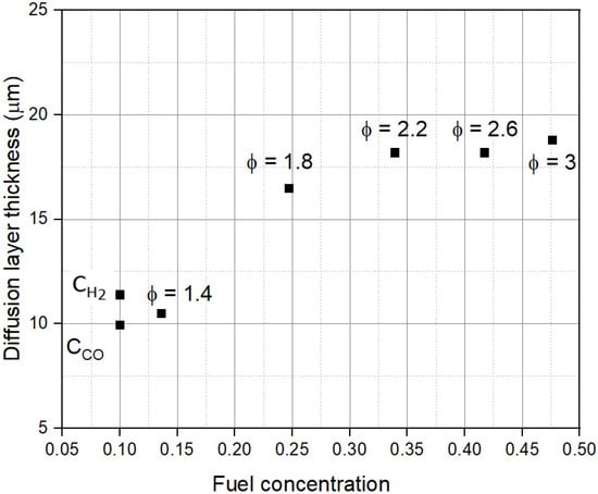 The Nernst diffusion layer is a virtual layer within which the gradient of ion concentration is constant and equal to the true gradient at the electrode–electrolyte interface. The thickness of this diffusion layer (δ) depends on the diffusivity of reactants [], which, as established by Equation (24), depends on the reactant concentration. With an O2− conducting electrolyte, this diffusion layer is present at the boundary of the anode and electrolyte. This model assumes no change in the fuel concentration from the bulk channel concentration to the anode-diffusion layer boundary.