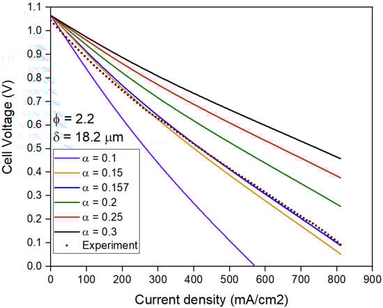 Since these results are based on fitted parameters, it is important to check the sensitivity of the model to α and δ. A high parameter sensitivity is better for ensuring that no other value of α and δ also match the experiment, potentially causing conflicting results. Figure 11 shows that the model is sensitive to change in the values of these parameters. As an example, we consider the case of Φ = 2.2. Figure 11 shows the variation of the j-V curves at a constant δ of 18.2 µm but varying α. The cell voltage at j > 0 increases with an increase in α due to reduction in ɳact. As only one value of α (0.157) over a wide range (0.1 < α < 0.3) matches the experimental curve, the results provide confidence in the model.