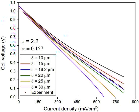 Similar to α, the model is very sensitive to δ, as can be seen in Figure 12. The cell voltage at j > 0 decreases with an increase in δ due to an increase in ɳconc. Only δ = 18.2 µm correctly matches the experimental result.