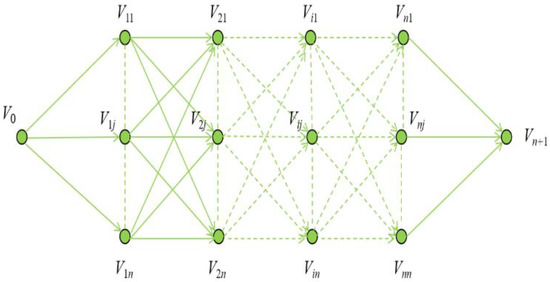 Step Four. The cost of state transition between adjacent stages was calculated. denotes the transfer cost from strategy in stage to strategy in stage . For example, denotes the transfer cost from strategy in stage 1 to strategy in stage 2.
