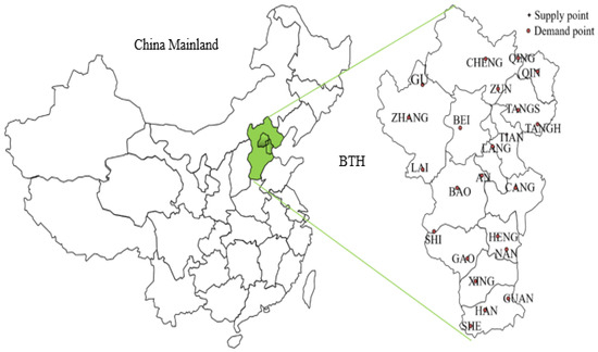 Location of BTH in China and distribution of supply and demand points. The cities correspond to Beijing (BEI), Tianjin (TIAN), Guyuan (GU), Zhangjiakou (ZHANG), Chengde (CHEN), Qinglong (QING), Qinhuangdao (QIN), Zunhua (ZUN), Tangshan (TANGS), Tanghai (TANGH), Laiyuan (LAI), Anxin (AN), Langfang (LANG), Baoding (BAO), Cangzhou (CANG), Shijiazhuang (SHI), Hengshui (HENG), Gaoyi (GAO), Nantong (NAN), Xingtai (XING), Guantao (GUAN), Handan (HAN), and Shexian (SHE).