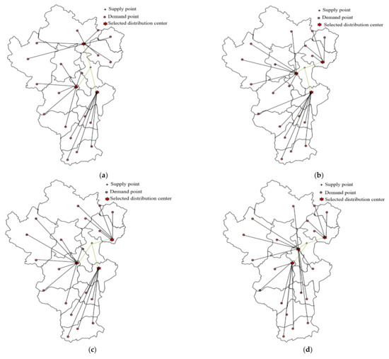 Optimal location and distribution in different stages. The names of the cities are listed in Figure. (a) The optimal location and allocation of stage one. (b) The optimal location and allocation of stage two. (c) The optimal location and allocation of stage three. (d) The optimal location and allocation of stage four.