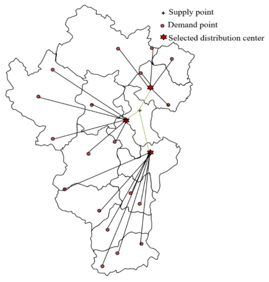 Optimal location and distribution with the shortest distance as the objective function. The names of the cities are shown in Figure 5.