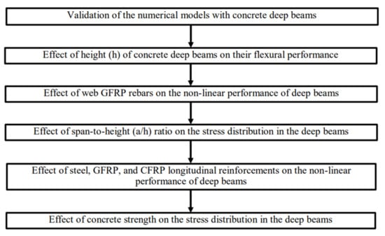 Figure 1 shows the flowchart of the research methodology in this study. First, the numerical models’ outputs were validated with the concrete deep beams’ results given by Zinkaah et al. [50]. Next, the effect of deep beams’ height, GFRP rebars, and a/h ratio on the non-linear performance of numerical models was assessed. Then, the influence of steel, GFRP, and CFRP longitudinal reinforcements and concrete strength on the stress distribution in concrete deep beam models was evaluated. The details of numerical models and material properties are presented in the following sections: