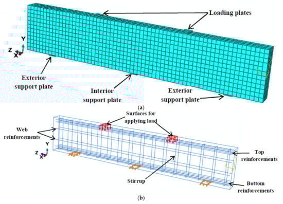 As per Figure 3, the strengthened concrete deep beams included stirrup, concrete deep beam, top, bottom, and web reinforcements, three rigid sections as exterior and interior support plates, and two other rigid sections as loading plates. The three-dimensional (3D) hexahedral element was employed for modeling of the concrete beams [51,52,53,54,55]. The truss element type of 3D deformable wire was used for modeling the reinforcements.