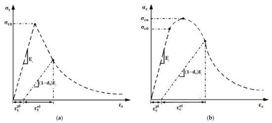 where compressive damage variable (DAMAGEC) is referred to as and tensile damage variable (DAMAGET) is referred to as . Also, is concrete Young’s modulus, and and are equivalent plastic strains at tension and compression, respectively [58,59].