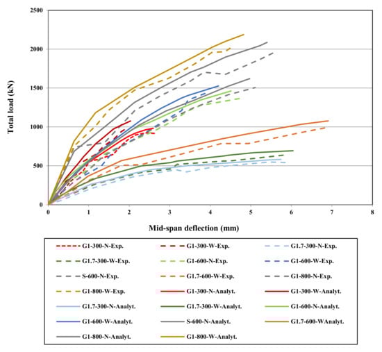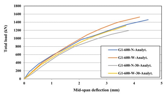 The curves of total load against mid-span deflection of the high- and normal-strength concrete deep beams with 600-mm height and reinforced with GFRP rebars are presented in Figure 20. The results showed that the failure loads of the high-strength concrete deep beams with and without the web reinforcement were obtained as 16.4% and 22.3%, respectively, more than those of the normal-strength concrete deep beams, and similarly to those reported by Khorasani and Esfahani [85] for conventional concrete beams strengthened with the GFRP rebar. It can be stated that the difference between the results of high- and normal-strength concrete deep beams with the web reinforcement (16.4%) was lower than that without the web reinforcement (22.3%). Therefore, the web reinforcement could somewhat compensate for the lower strength of the normal concrete to strengthen the deep beams in carrying the ultimate load.