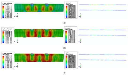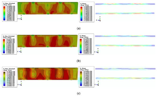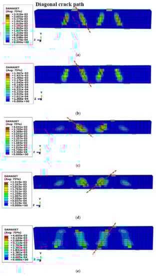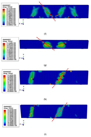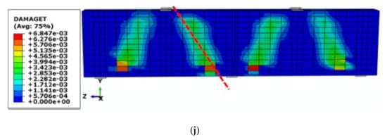 As per Figure 7b, Figure 8b and Figure 9b, under the main diagonal cracking load, the concrete components’ maximum tensile stress, including different heights, appeared to be between the interior support plate and the loading plates, in the range of 5.06–5.44 MPa. The tensile strength of concrete could be considered as about 10% of compressive strength [62,63], which was equal to 5.4 MPa, near to the same range obtained in this study, as mentioned earlier. Therefore, it can be inferred that the diagonal crack was propagated between the interior support plate and one of the loading plates, where the maximum tensile stress raised in the concrete components, similar to that observed in the plots of the tensile damage variable (DAMAGET) (Figure 6a,e,h).