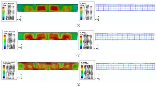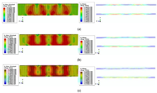 Stress distribution in the G1.7-600-W model under applied loads of first flexural (a) and diagonal (b) cracks; and failure load (c); the legends use the MPa unit.