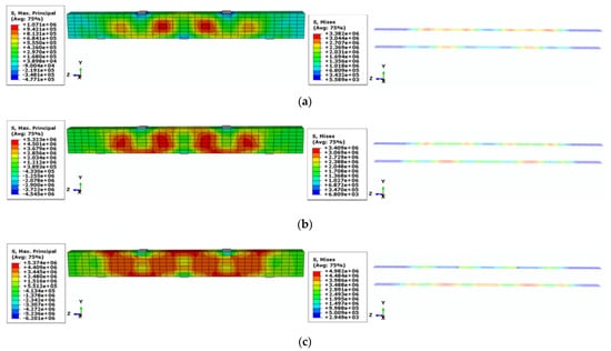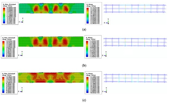 The stress distributions in the concrete deep beams with the web GFRP rebars under applied loads of first flexural and diagonal cracks and failure load are shown in Figure 10, Figure 11 and Figure 12. The stress distribution was the maximum tensile stress, but not the maximum absolute value of the stress.