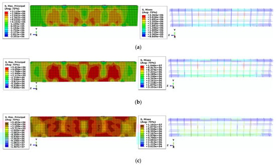 Under the first flexural cracking load, the maximum stress in the concrete components with the heights of 300, 600, and 800 mm was equal to 0.68, 3.12, and 3.48 MPa, respectively, as indicated in Figure 10a, Figure 11a and Figure 12a. The corresponding values for the GFRP reinforcements were 1.22, 3.37, and 3.64 MPa, respectively. Therefore, the maximum stress in the concrete and reinforcement components was improved by the height increment of the concrete deep beams with web GFRP reinforcement, similarly to what was observed for the concrete deep beams with the absence of web reinforcement (Figure 7a, Figure 8a and Figure 9a). However, the stress intensity in the concrete components was dissipated more along the beam length in the concrete deep beams with web reinforcement than in those with no web reinforcement. For instance, the web reinforcement collaborated with the concrete component to effectively dissipate the stress intensity along the whole length of the concrete deep beam with a height of 800 mm, as shown in Figure 12c.