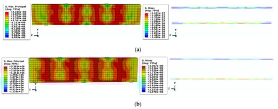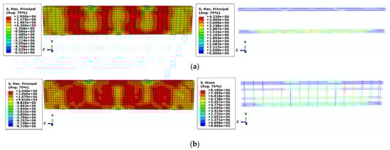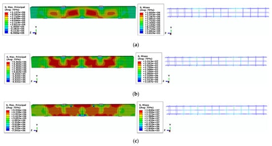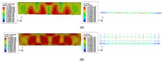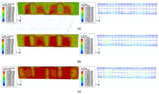 The stress distributions in the concrete deep beams without the top longitudinal reinforcement under failure load are depicted in Figure 19. As per the results, the maximum tensile stress propagation along the beam length of the concrete component without the top reinforcement (Figure 19) was not as much as that of the concrete component with the top reinforcement (Figure 8c and Figure 11c). In addition, with the absence of the top reinforcement, the maximum tensile stresses in the reinforcements of deep beams with and without the web rebar were 11.27 and 6.26 MPa, respectively, which showed that the maximum tensile stress was dissipated more in the concrete component of the deep beam with the web rebar than that without the web rebar (Figure 19). That is why the failure load of the concrete deep beam with the web rebar was obtained by 7.7% more than that without the web rebar when there was no top reinforcement, as presented in Figure 18. It is noteworthy that the stress intensity was dissipated more in the web reinforcement embedded near to the top reinforcement than that embedded near to the bottom reinforcement, as shown in Figure 19b.