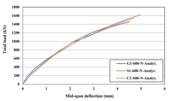 The total load against mid-span deflection curves of the concrete deep beams with 600-mm height and reinforced with longitudinal steel, GFRP, and CFRP rebars were compared to each other, as depicted in Figure 16. As per the results, the concrete deep beams strengthened with GFRP, CFRP, and steel top and bottom reinforcements failed up to 1462, 1532, and 1621 MPa, respectively. Therefore, the ultimate load-carrying resistance of the concrete beams with a height of 600 mm and without the web reinforcement increased by up to 4.8% and 10.9% by replacing the GFRP reinforcement with the CFRP and steel reinforcements, respectively.