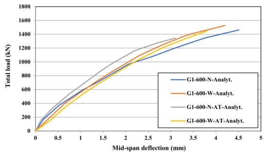 Figure 18 shows a comparison between the curves of total load against mid-span deflection for the concrete deep beams with and without top longitudinal reinforcement. With the absence of the web reinforcement, the failure loads of the concrete deep beams with and without the top reinforcement were equal to 1462 and 1331 MPa, respectively. The corresponding values for the concrete deep beams with the presence of the web reinforcement were 1527 and 1449 MPa. Therefore, with the absence of the web reinforcement, the failure load was obtained 8.7% more for the concrete deep beam with the top reinforcement (G1-600-N) than that without the top reinforcement (G1-600-N-AT). The corresponding difference was 5.4% with the presence of web reinforcement. It can be stated that the web reinforcement slightly compensated for the absence of the top rebar to reinforce the concrete deep beams in carrying the ultimate load.
