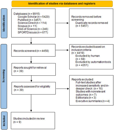 A search of electronic databases and scanning the reference lists yielded 9915 relevant studies. After removing duplicates, 4458 studies were screened. Then, 39 studies were selected and screened for eligibility, based on the inclusion criteria. Lastly, nine relevant studies were included in the systematic review, presented in Figure 1 and Table 3.