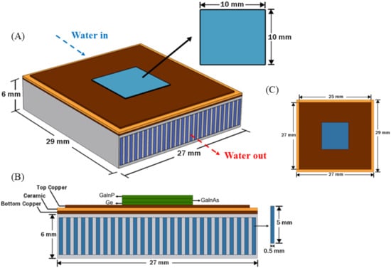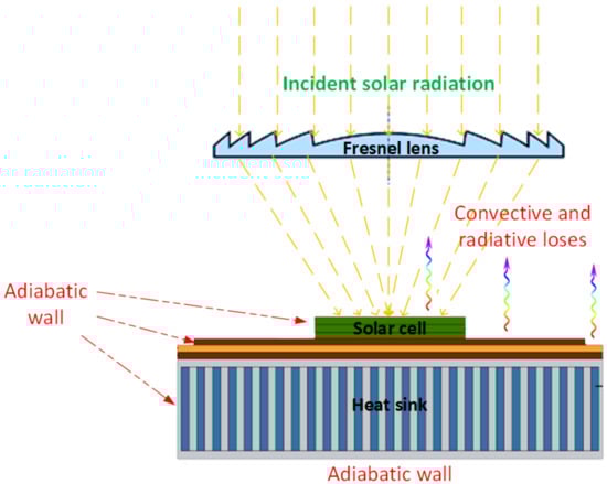 The easiest approach to disperse heat from CPV systems is by passive cooling with flat plate heat sinks. Flat plate heat sinks are often used in CPV systems with concentration ratios less than 500× [5,6]. Valera et al. [7] studied the feasibility of the same mechanism under concentration ratios ranging from 2000×–10,000×. Solar cell downsizing is a critical factor to be addressed for appropriate thermal management at extremely high concentration levels. Furthermore, for better thermal management, larger heat sink substrate thickness and area are necessary, but unfortunately the extracted heat cannot be utilized for other purposes. When cost is considered, aluminum heat sinks are shown to be superior to copper heat sinks. According to Alzahrani et al. [8], a micro-finned heat sink has a 22–25% higher heat dissipation than a flat plate heat sink. Aldossary et al. [9] investigated the technical feasibility of cooling CPV systems with passive and active systems in severe environments with ambient temperatures approaching 50 . Heat sinks with round pin fins and straight fins were studied for both passive and active cooling, but passive cooling was insufficient to keep the cell’s operating temperature below 80 at a concentration ratio of 500×, whereas active cooling can provide better electrical performance with lower cell temperature.