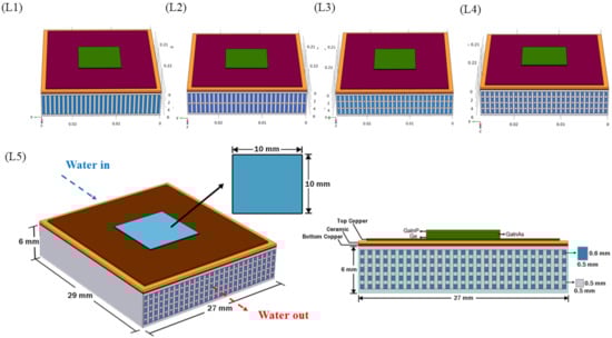 Geometric model of the net channel heat sink of aluminum heat sink (L1) Conventional mini channel heat sink (L2) Net channel heat sink with 2 layers, (L3) Net channel heat sink with 3 layers, (L4) Net channel heat sink with 4 layers, and (L5) Net channel heat sink with 5 layers.