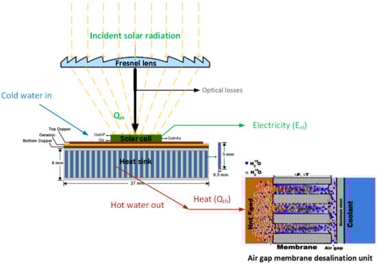 - AlFalah, G.; Maatallah, T.S.; Okasha, A.; Al-Amri, F.G. Design and optimization study of a densely packed ultrahigh concentration photovoltaic thermal array for desalination usability. Int. J. Energy Res. 2021, 46, 1693–1710. [Google Scholar] [CrossRef]