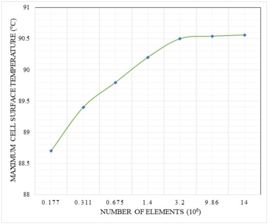 The generated mesh is a physics-controlled mesh. The mesh has been created including the mesh element types adopted to the physics that have been included in the developed model settings. This also goes for any boundary condition, domain condition or constraints applied to the model geometry. In the current study, the generated mesh has a customized number of Tetrahedral shaped-elements. Grid independence study was carried out to ensure the accuracy of the modeling cases. The test independence test has been performed for each studied case, and for the sake of illustration, the case of the conventional mini channel heat sink design is demonstrated in this section. In Figure 6, the variation of the maximum solar cell temperature is plotted against the number of mesh element sizes, which is varied from 0.177 × to 14 × . The figure revealed that the maximum surface cell temperature has an almost constant value for the grid elements from 3.2 to 14 million elements. In addition to that, the most appropriate number of elements that represent the most accurate data and computational time was considered as 3.2 million.