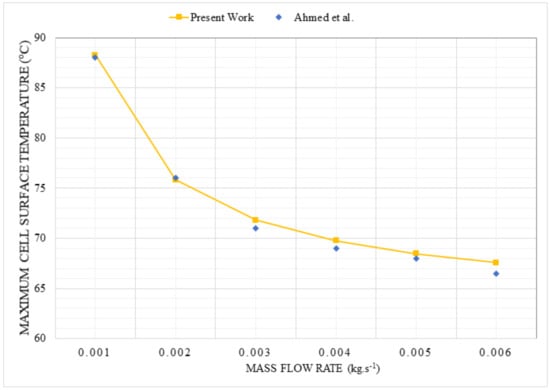 The validation of the HCPV system was carried out and conducted against Ahmed et al. [21] to ensure the accuracy of the numerical simulation. Figure 7 depicts the tendency of the maximum solar cell temperature against different water flow rates at the same CPV module dimensions, thermophysical properties, and applied boundary conditions. Increasing the water flow rate for both Ahmed et al. [21] model and the present work has a positive effect on decreasing the maximum solar cell temperature. The obtained results based on the developed numerical model compared to the work of Ahmed et al. [21] has yielded a maximum error of about 1.6%, while the minimum error was 0.3%, confirming the validation of the validity of the numerical simulations.