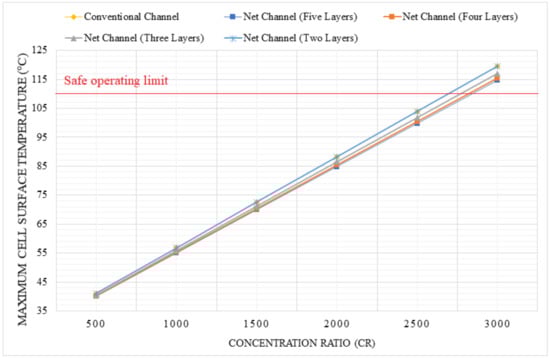 The performance of the HCPV system using water as a cooling fluid at various concentration ratios is demonstrated for the four distinct configurations of the net channel design and the conventional mini channel. The fluctuation of the maximum solar cell temperature at a mass flow rate of / and with varied concentration ratios ranging from 500× to 3000× is shown in Figure 8. The objective of these net channel configurations is to keep the maximum measured temperature at different concentration ratios below the manufacturer’s maximum recommended temperature (110 ). From the recorded data the maximum temperature for all configurations was achieved by the conventional channel where the temperature of the cell reached up to and at concentration ratio of 3000× and 2000×, respectively. While the best scenario and lowest temperature were observed by using the parallel flow net channel with five layers. In effect, under the mass flow rate, the reduction in maximum solar cell temperature has varied from to under a concentration ratio of 3000× and 2000×, respectively. Under the same test conditions, the other configurations were ranged between the conventional and the parallel flow net channel with five layers. It is worthy to note that the mass flow rate of / has been set in all numerical simulations as it has yielded the maximum water outlet temperature using mini-channel based-heat sink, which fall within the interest of maximizing the thermal energy recovered from the HCPV system that would be effective for potential applications such as desalination.