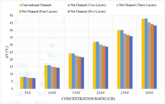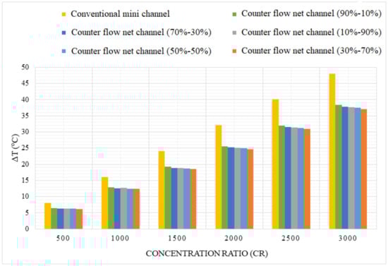 In addition to the maximum cell surface temperature, the temperature distribution of the solar cell, in other words the temperature uniformity, at different concentration ratios and a mass flow rate of / is presented in Figure 9. The overall system performance of the HCPV system will improve significantly as the temperature range (difference between the maximum and minimum cell temperature) decreases. The parallel flow net channel design with five layers has shown the most uniform temperature distribution, which significantly reduced the extend of the hot spots over the cell surface area, followed by the four, three, and two-layers mini channel designs, whereas the conventional mini channel design has exhibited the worst scenario with a temperature range increase by relatively compared to net channel design of five layers. The temperature range of the net channel design with five layers was ranged from to , under concentration ratios varying from 2000× to 3000×, respectively. So it is evident that, the new parallel flow net channel configurations outperform the conventional channel in terms of maximum solar surface temperature and temperature uniformity across the solar cell.