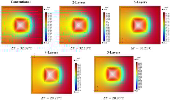Figure 10 shows the contours diagram for the temperature T (in Celsius) over the solar cell and the top copper layer of the substrate for all investigated configurations at a geometrical concentration ratio of 2000× and water flow rate of /. Figure 11 shows the contours diagram for the temperature, T (in Celsius) over the solar cell and the top copper layer of the substrate for the five-layers net channel configuration at all considered geometrical concentration ratios ranging from 500×–3000× and a water flow rate of /. As the number of layers increases, all thermal resistances increase, and the flow rate at each layer decreases. This results in an increase in the bulk flow resistance. Moreover, as the number of layers increases, the fin efficiency, and the heat transfer coefficient decrease. These effects cause an increase in the convection resistance in each individual layer. Whereas, this increase in thermal resistance can be compensated by the increase in heat transfer areas (for a number of layers above two) because the thermal resistances are in parallel in the resistance network.