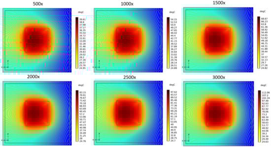 Temperature contours across the solar cell for the five-layers net channel configuration at all considered geometrical concentration ratios ranging from 500×–3000× and a water flow rate of /.