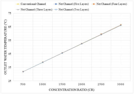 The increase of the outlet water temperature results in increasing the maximum extracted energy from the solar cell and allowing more adequate range of hot feed-in water to the desalination units, then improved diffusion effect and gained output ratio. The variation of the outlet water temperature at a constant mass flow rate of / with varied concentration ratios ranging from 500× to 3000× is shown in Figure 12. According to the observed results, the outlet water temperature was recorded to be almost constant for all the parallel flow net channel designs. The outlet water temperature for heat sink design with five layers reached up to and , respectively, under concentration ratios of 2000× and 3000×. This range of outlet temperature can operate effectively an air-gap membrane desalination since it falls within the range of the optimal hot feed-in water temperatures [27,28]. Furthermore, for all tested conditions, the outlet water temperature using the conventional and all new parallel flow net channel configurations is approximately the same and close to each other. Besides that, increasing the concentration ratio had a significant effect on increasing the outlet water temperature for all configurations.