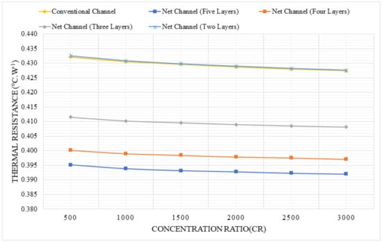 Thermal resistance is regarded as an important factor in improving the overall performance of the HCPV system by enhancing the heat transfer between the heat sink channel and the working fluid. As thermal resistance decreases, system performance improves, resulting in effective temperature distribution for the solar cell surface, which is considered as a considerable solution to the overheating issue, and the best of heat sink performance. The variation in thermal resistance versus concentration ratios at a constant flow rate of / is shown in Figure 13. Since the mini channel heat sink is thin and the materials used, such as silicon, have very high thermal conductivity, the conduction resistance is normally a small part of the overall resistance. For small flow rates (that has been fixed constant in each configuration), pressure drop is still small and the bulk resistance is still significant compared to the convective thermal resistance than can increase only for high flow rates even with more number of layers and higher fin efficiencies once the adiabatic fin-end boundary condition is applied. These reasons can explain the closed values of the thermal resistances, as well as the outlet temperatures at a small mass flow rates, therefore no configuration has the upper hand over the others in terms of higher outlet temperature. According to the results, the parallel flow net channel design with five layers has the lowest thermal resistance of /, while the conventional and parallel flow net channel with two layers designs have the highest thermal resistance of / at the same flow rate.